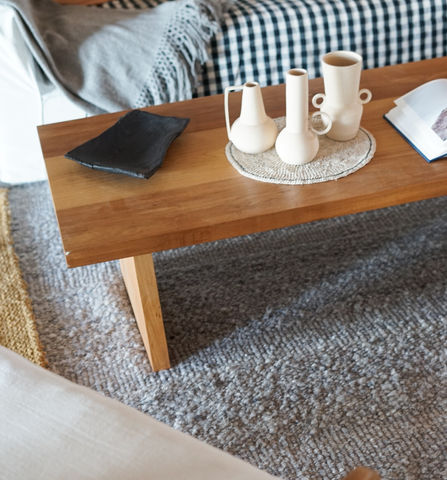 Mesa de petiribí con terminación hidrolaca. Patas planas y tapa de 2″ de espesor.